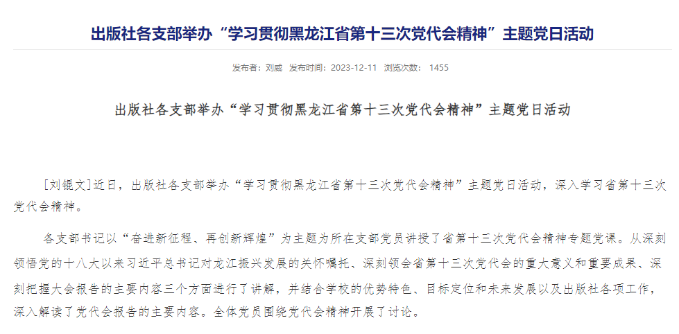 出版社各支部舉辦“學習貫徹黑龍江省第十三次黨代會精神”主題黨日活動[劉錕文]近日,出版社各支部舉辦“學習貫徹黑龍江省第十三...